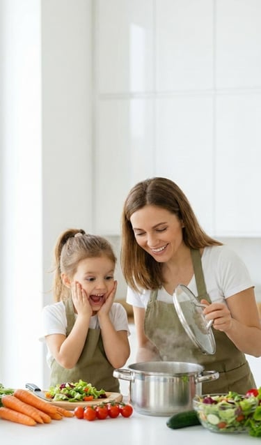Por meio de histórias encantadoras, receitas simples e atividades educativas, a criança aprende sobre frutas e legumes de forma natural — participando, experimentando e criando curiosidade, sem pressão ou brigas à mesa.